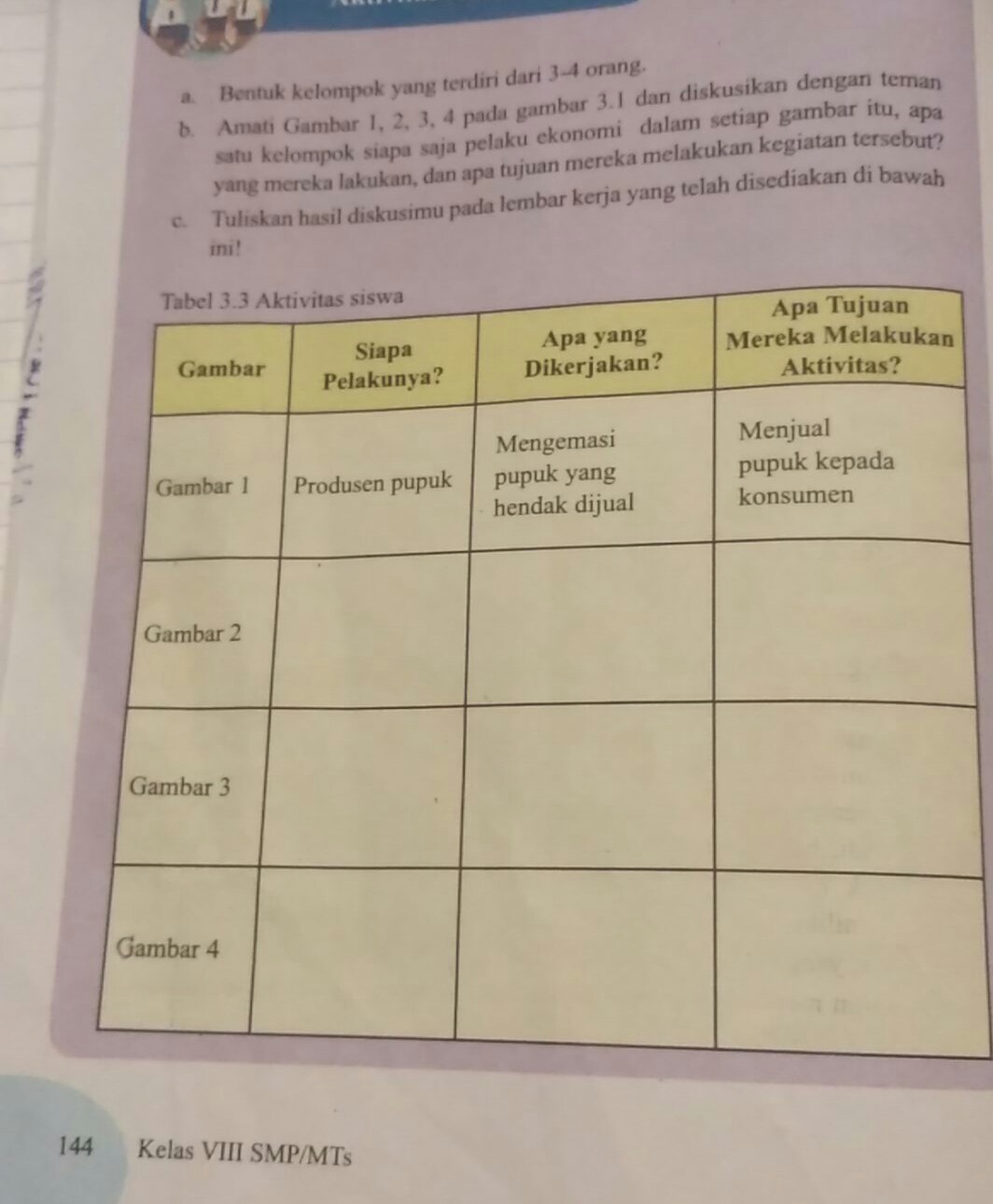 Tujuan melakukan aktivitas adalah untuk menjual pupuk hasil produksi. Gambar 2, pelakunya adalah siswa dan siswi, aktivitas yang dilakukan adalah membeli makanan dan minuman di kantin, tujuan mereka melakukan aktivitas tersebut adalah untuk memenuhi kebutuhan konsumsi. Jan 21, 2021 · tabel tentang aktivitas siswa,siapa pelakunya?,apa yang dikerjakan?,apa tujuan mereka melakukan aktivitas?. More images for gambar siapa pelakunya apa yang dikerjakan apa tujuan mereka melakukan aktivitas » Mengimpor barang dari luar negeri tujuan: Mengemasi menjual gambar 1 produsen pupuk pupuk yang pupuk kepada hendak dijual konsumen gambar 2 gambar 3 gambar 4 Jan 12, 2019 · siapa pelakunya? Gambar 1:produsen pupuk mengemasi pupuk yang hendak di jual. Pegawai pajak apa yg dikerjakan: Tabel 3.3 aktivitas siswa siapa apa yang apa tujuan gambar pelakunya? Menarik pajak masyarakat tujuan mereka melakukan aktivitas: Menjual dan memenuhi permintaan konsumen akan barang impor Apa tujuan mereka melakukan aktivitas??